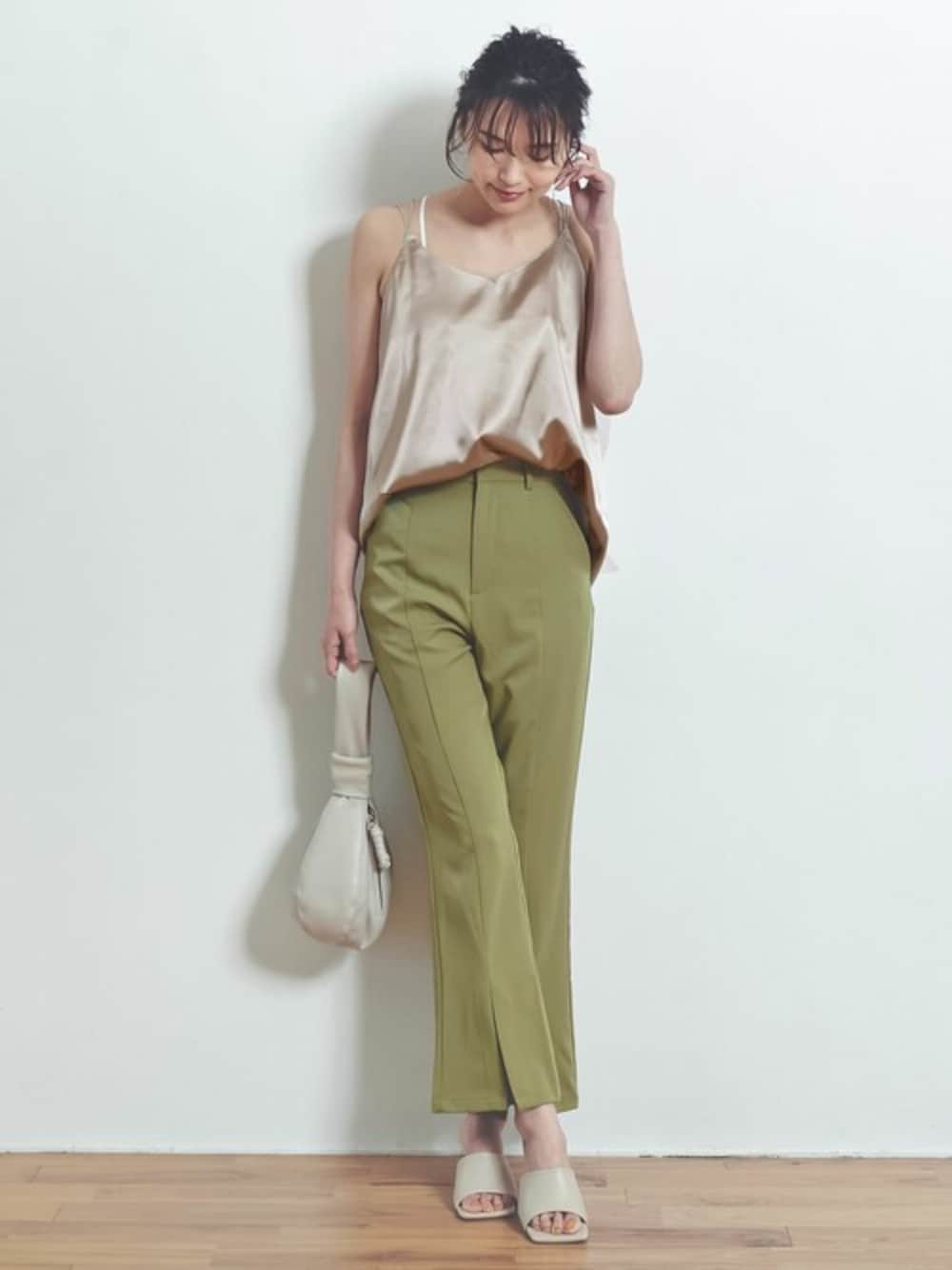 華奢なサテンキャミに爽やかなグリーンのカラーパンツを合わせた、大人のカジュアルフェミニンスタイル。 夏らしい豊富なカラーバリエーションが嬉しいフレアパンツは、旬のフロントスリットデザインが大人のこなれ感を演出します。
