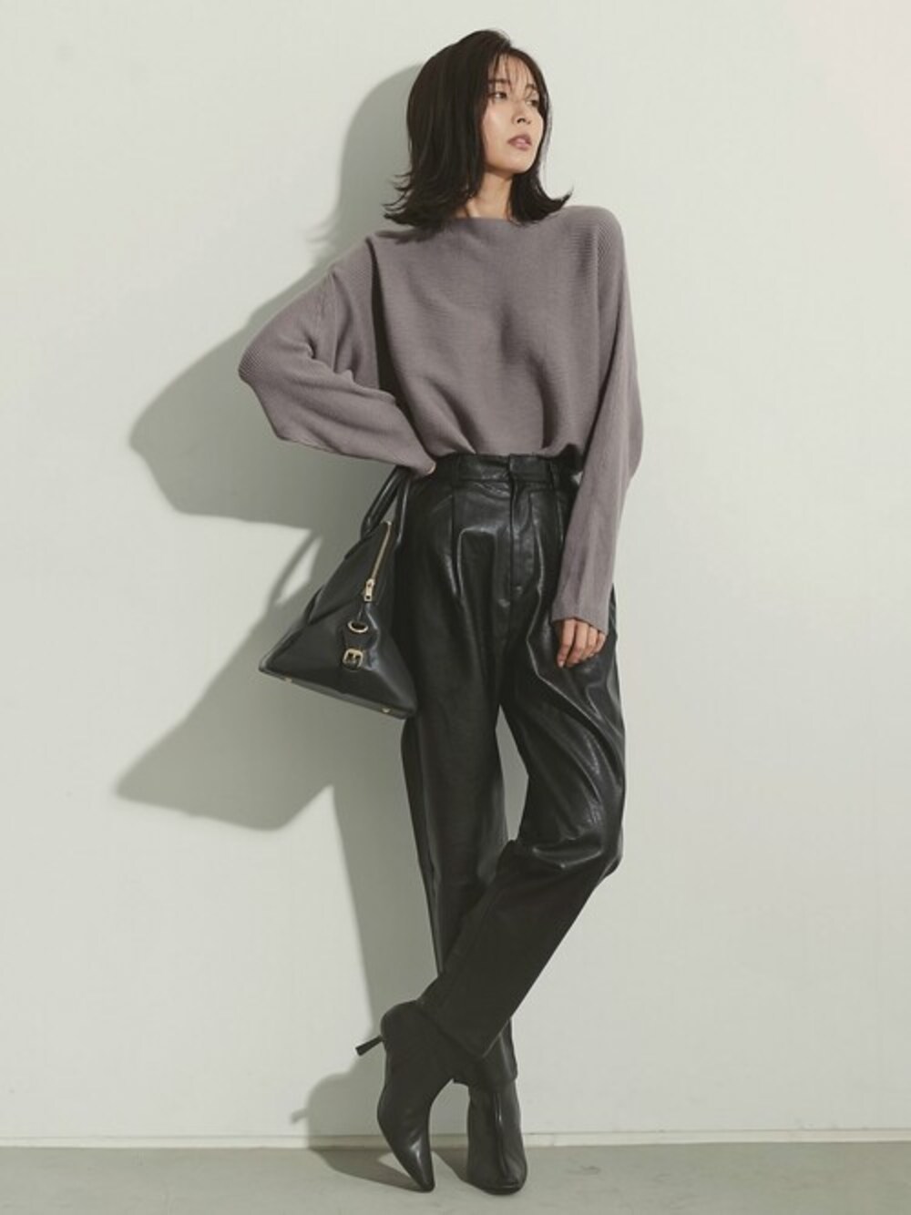 上品かつシックなモノトーンコーデ。 ボートネックリブニットは、デコルテラインを美しくみせ、ヘルシーかつ上品な印象に。 ぽわんとしたお袖がフェミニンな印象のトップスに、ヴィーガンレザーパンツを合わせ、マニッシュさをプラス。 ペグトップのシルエットが大人の魅力溢れるシックなコーディネートに引き立ててくれます。