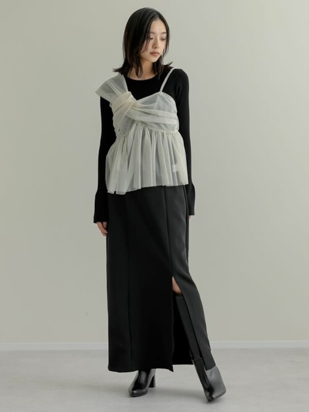 🕊bustier:138519 柔らかなチュール素材で、エレガントな印象に仕上がります。 シンプルなカットソーやタンクトップなどとのレイヤードで着用するだけで、クラスアップしたスタイリングを確立。 合わせるインナーを変えれば、オールシーズン着用できるのも魅力です。 🕊inner:137264 配色デザインが効いたモードな印象のクルーネックニットトップス。 腕を華奢に長く見せるフレアスリーブデザインで仕上げました。 大人気のリブニットシリーズ(137107・137108)と同様の糸で編み立てました。 🕊shirt:139251 ツイル素材のしっかりとした質感が上品な印象をプラス。 サイドにスリットが入っており、動きやすさと女性らしいシルエットに仕上げました。 すっきりとしたナローシルエットが、身体のラインを美しく見せ、縦のラインを作ることでスタイルアップ効果も期待できます。