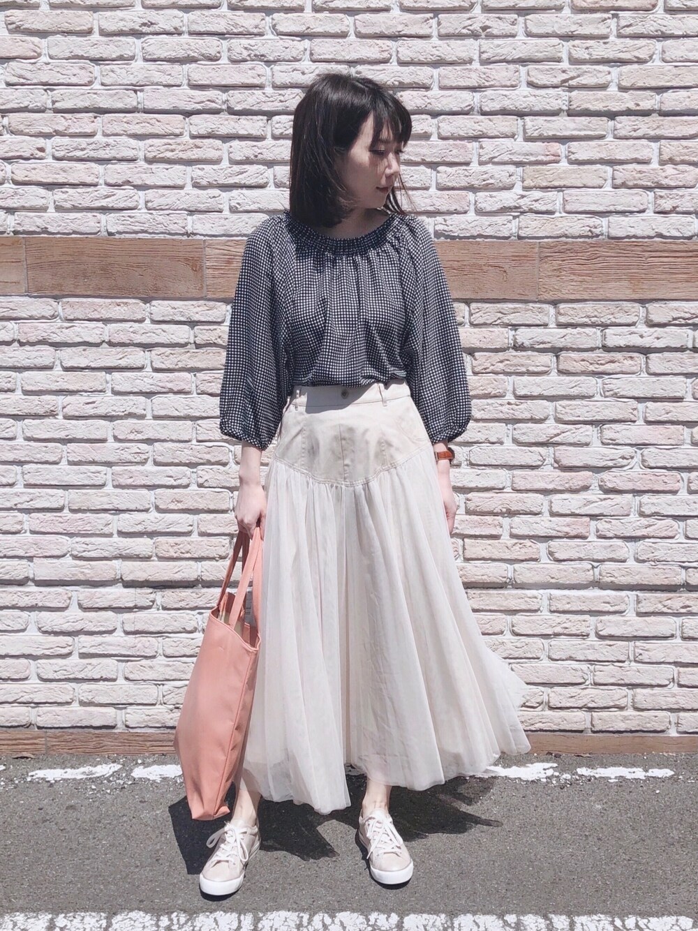 ご覧頂きありがとうございます💓 いいね、お気に入り登録、フォロー フォルダインとっても嬉しいです🥺💕 world online storeのスタイルスナップにも たくさんスタイリング掲載しているので そちらもチェックしてみて下さいね💓 ギンガムチェック×チュールスカートで 大人のガーリーコーデ✨ スニーカーでカジュアルダウンすることで 大人女子も挑戦しやすいです👍 サーモンピンクのトートバッグで アクセントを付けました😉