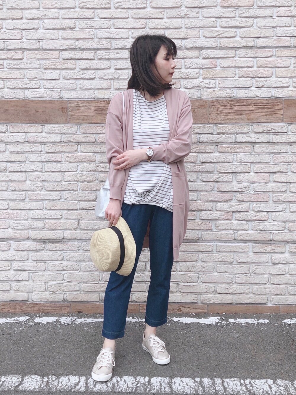 ご覧頂きありがとうございます💓 いいね、お気に入り登録、フォロー フォルダインとっても嬉しいです🥺💕 world online storeのスタイルスナップにも たくさんスタイリング掲載しているので そちらもチェックしてみて下さいね😉 普段はピンクを着ないという方にも オススメのくすみピンクのカーディガン💕 コーデに取り入れるだけで 春らしさがぐんとアップします🌸 寒暖差が激しいこの時期にもピッタリ✨ ボーダーのプルオーバーと テーパードパンツは カジュアルコーデの定番‼️ セットで持っておけば 羽織りを変えるだけで 何コーデも作れちゃいます👍 足元はゴールドのエコレザースニーカーで 軽やかさを出してみました😉