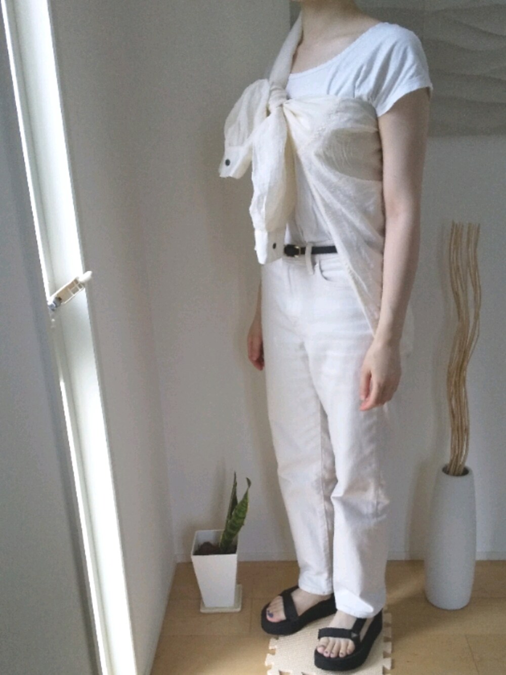 オールホワイト シアーシャツのアレンジ 夜寒いなぁと思いながら毛布出さずにいたら結局あんまり眠れなかった😔