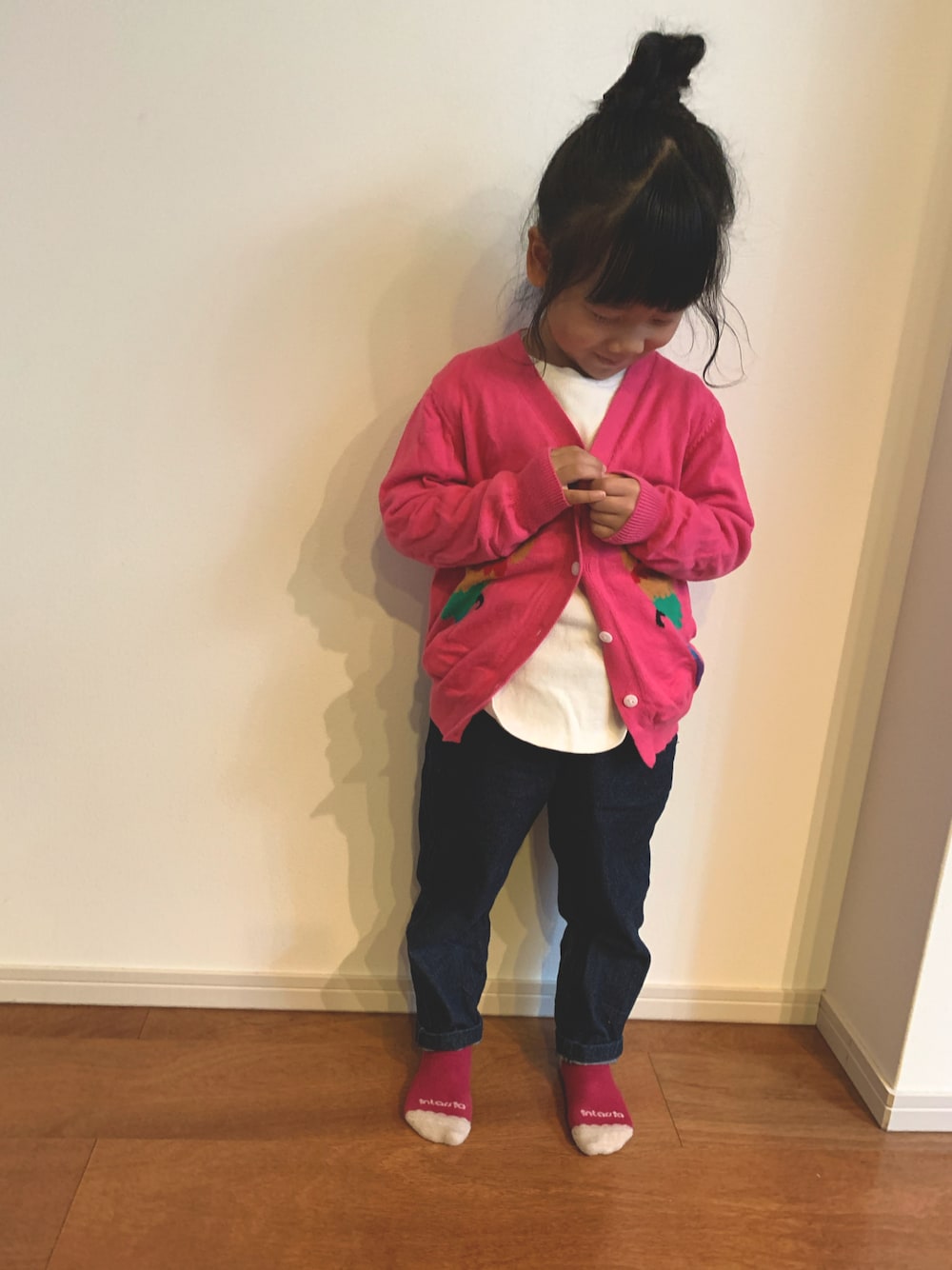 ブルー系のパンツ、ピンク系のカーディガン/ボレロを着用したキッズの秋コーディネートの1枚目の写真