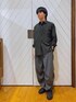 やや光沢のあるシャツをナイロンパンツと合わせてスポーティに組みました。軽い生地で動きやすいです。