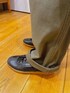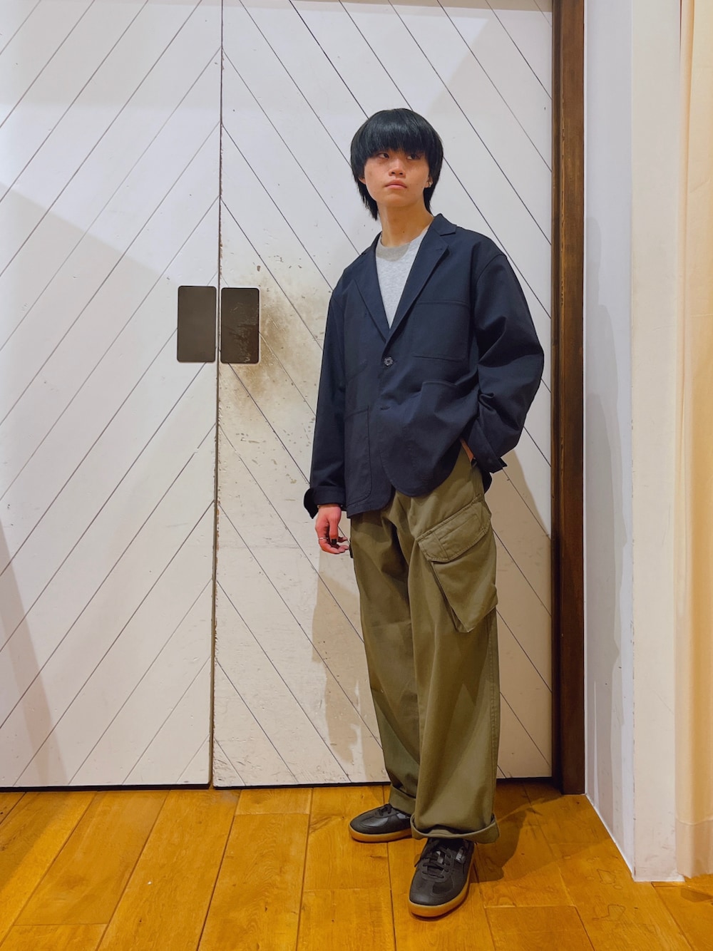 ジャケットのフォーマルな印象をカーゴパンツで中和しました。紺色とカーキの組み合わせなので、他のアイテムは白、黒、グレーのいずれかにするとまとまりが出ると思います。