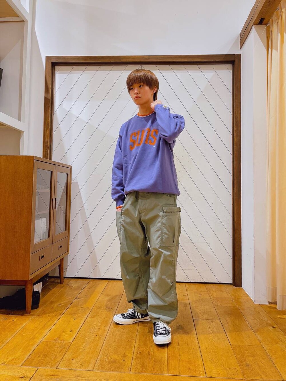 スゥエットにカーゴパンツを合わせてポップな印象にしました。袖のパッチやパンツのポケットなど、細かい所にこだわりが伺えるコーディネートです。