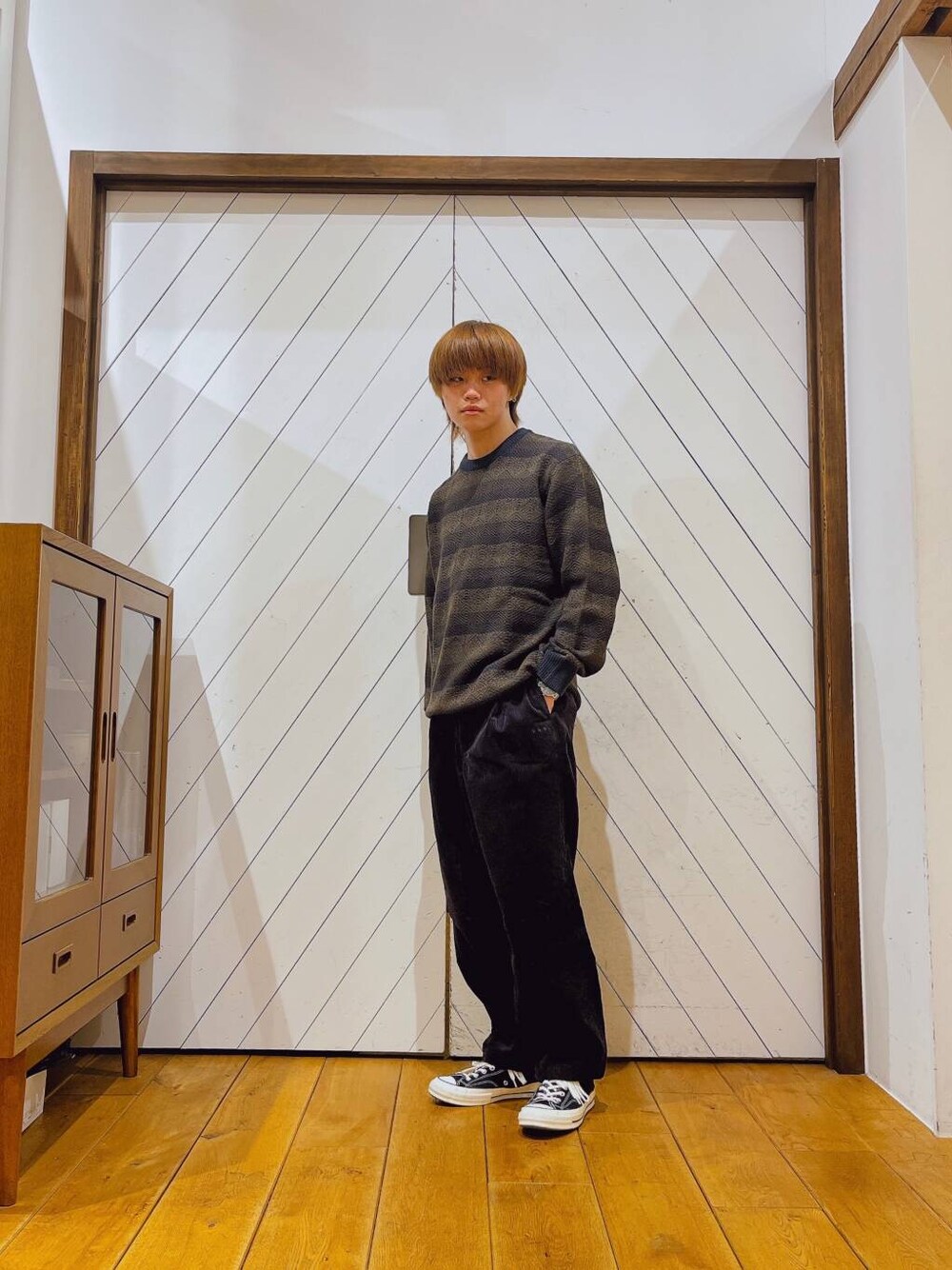 ジャガードニットとコーデュロイパンツの暖かみのある組み合わせです。ニットの柄は落ち着いた色味で様々なパンツと組み合わせられます。
