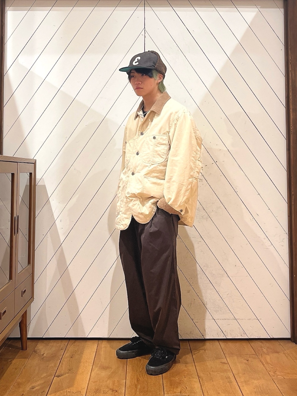 暖色でまとめました。キャップのボアとジャケットのコーデュロイで季節感を出しています。