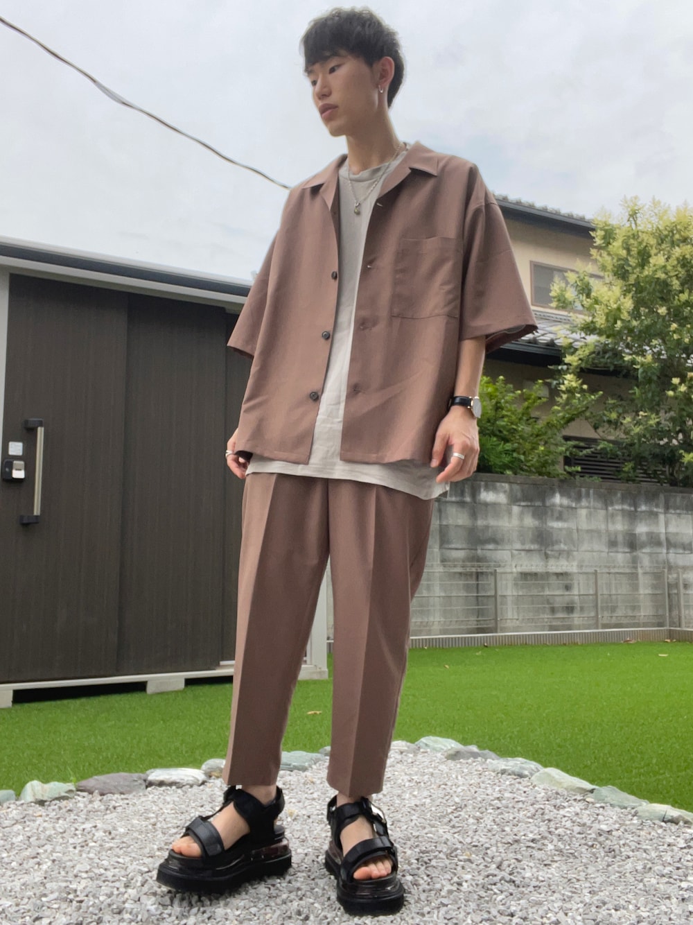 GUのドライワイドフィットオープンカラーシャツとドライワイドテーパードイージーアンクルパンツのセットアップコーデ🐕 HAREの厚底サンダルお気に入りです🥰 size tops:XL inner:XL pants:S