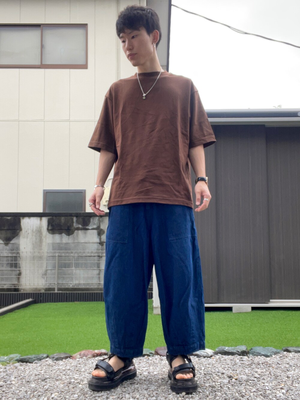 ブラウンのTシャツとデニムのバルーンパンツを使った秋先取りコーデ🍂