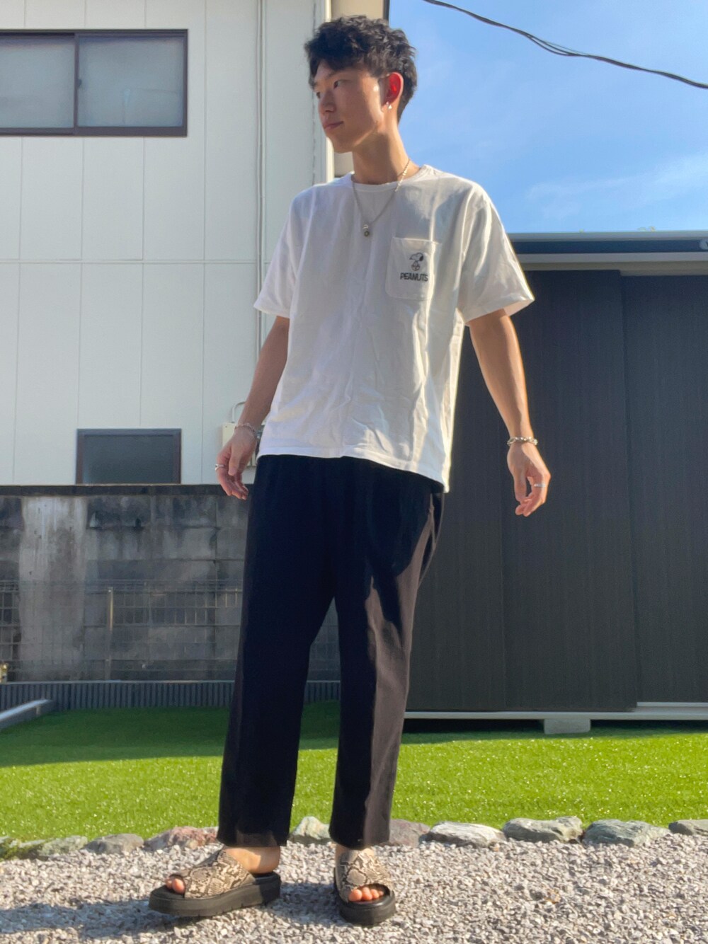 全身RAGEBLUEのアイテムを使ったモノトーンコーデ🐼 胸元に刺繍されたスヌーピーがかわいらしいです🐶