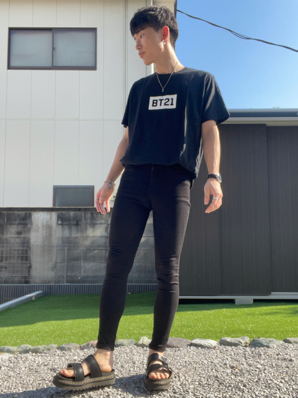 BT21 UTを黒スキニーにタックインした全身ブラックコーデ🐈⬛