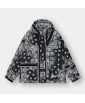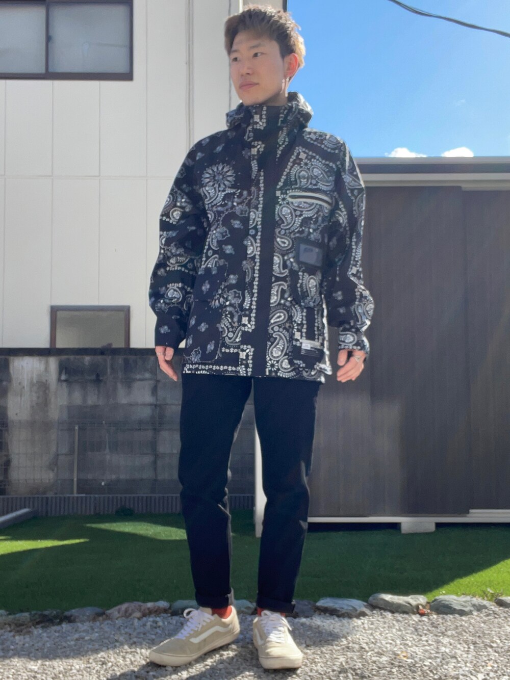 マウンテンパーカーを使ったGU×MIHARAYASUHIROコーデ🦓 バンダナ柄のマウンテンパーカーが主張感があるので、ほかのアイテムをシンプルなもので合わせました😉