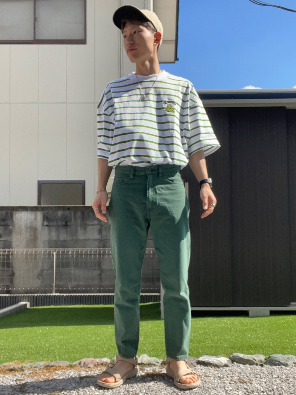 グリーン×ベージュ💚🏼 ボーダーTをタックインしてキャップとスポーツサンダルを合わせたカジュアル夏コーデです🙂 カーミットのワンポイントがかわいいです🐸
