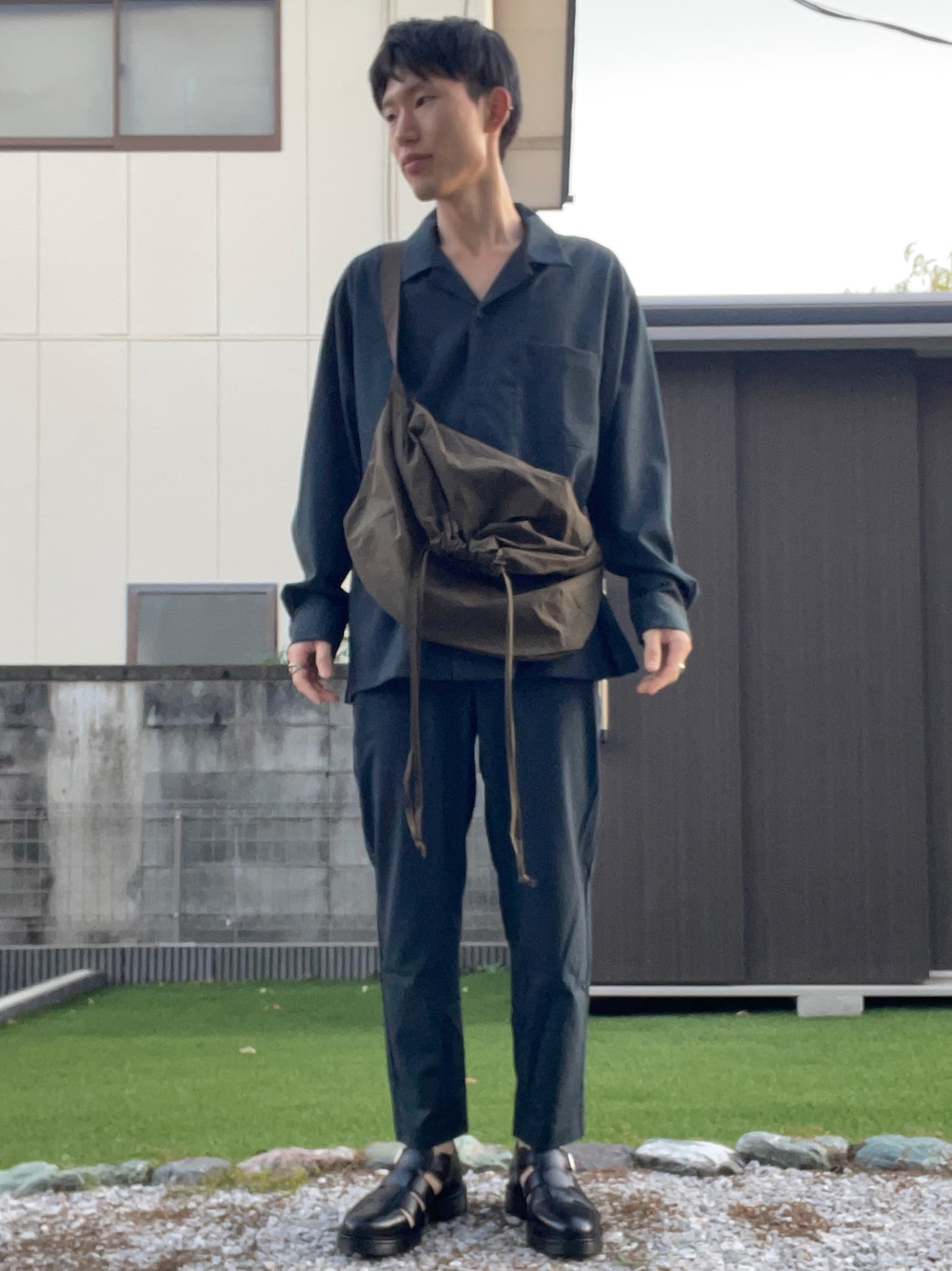 セットアップコーデ☕️ グリーンのオープンカラーシャツとパンツにUNIQLO Uのショルダーバッグを合わせたきれいめ秋コーデにしました🦔