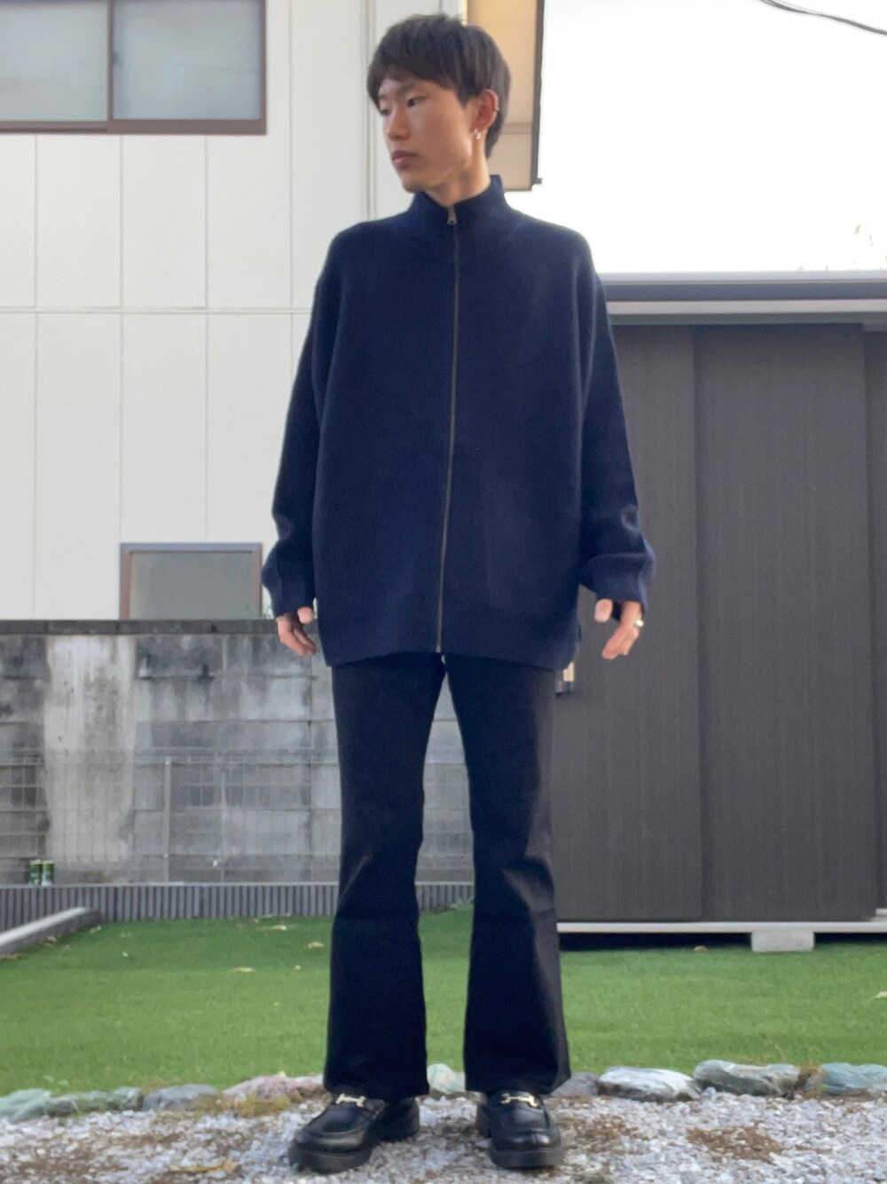 シンプルコーデ ドライバーズニットとフレアジーンズにビットローファーを合わせたきれいめコーデです😸