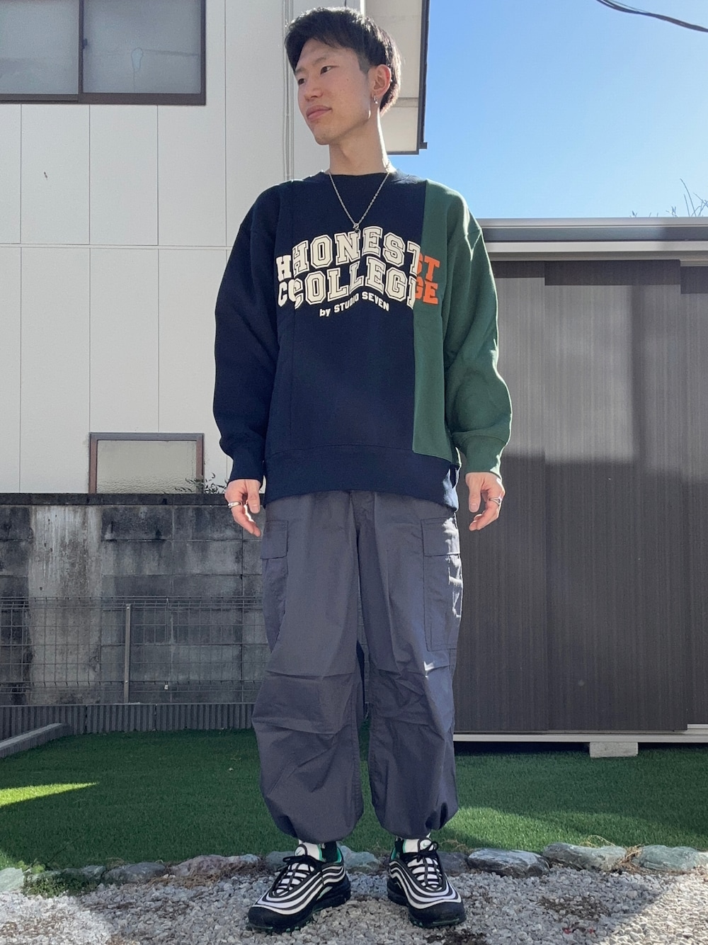 スウェットコーデ🐩 大胆なデザインのスウェットにカーゴパンツを合わせてカジュアルスタイルに🕺