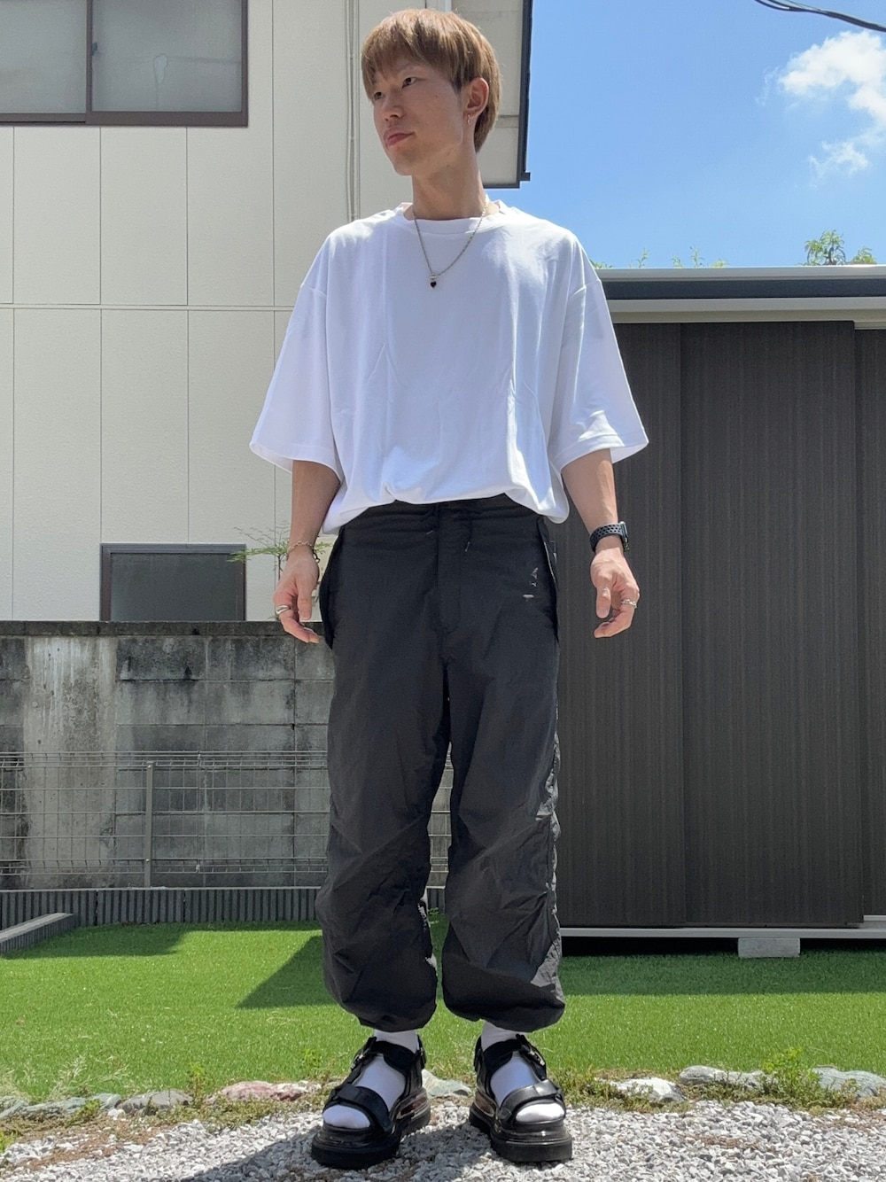 モノトーンコーデ🪮 オーバーサイズの白Tをパラシュートパンツにタックインしたシンプルコーデ🪿