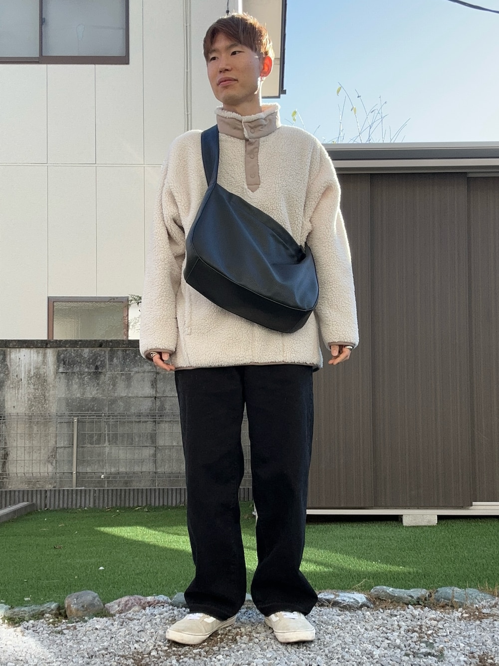クリスマスコーデ🎅 もこもこトップスにレザー素材のデカバッグを合わせてモノトーンでまとめました🙂