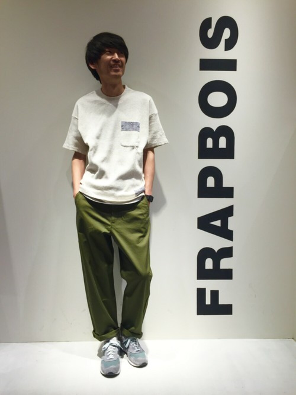 お店には夏物アイテムがドーンと入荷して参りました! その中からオススメのご紹介を。 サーマル生地のカットソーは、 ゆったりとイージーなシルエットと、 サラリとした素材感で、 着心地バツグンの1枚です。 胸ポケットと裾のギンガムチェックがアクセント。 シンプルなルーズチノパンと合わせて、 リラックスした感じで着てみました。