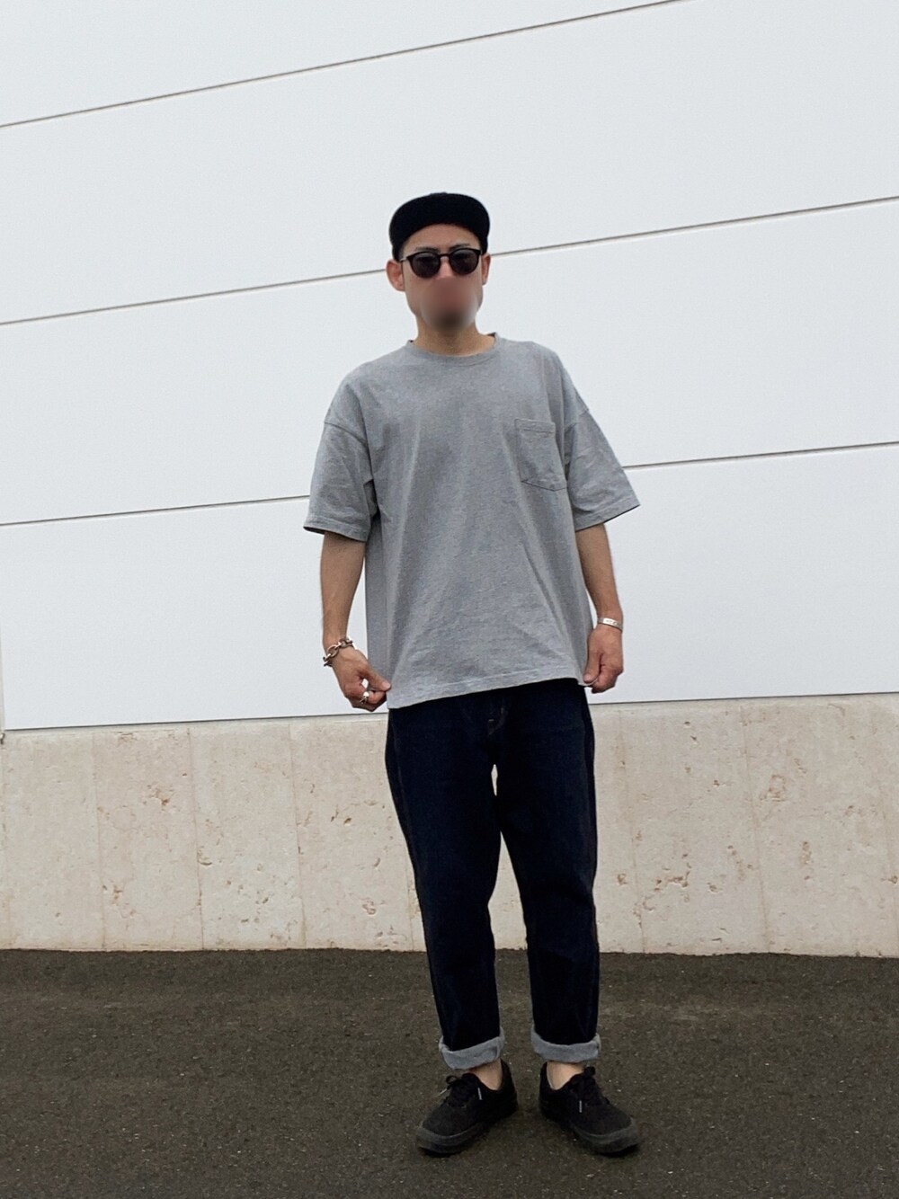 GUのTシャツとUNIQLOの濃いめのデニムパンツでシンプルにスケーターコーデ。