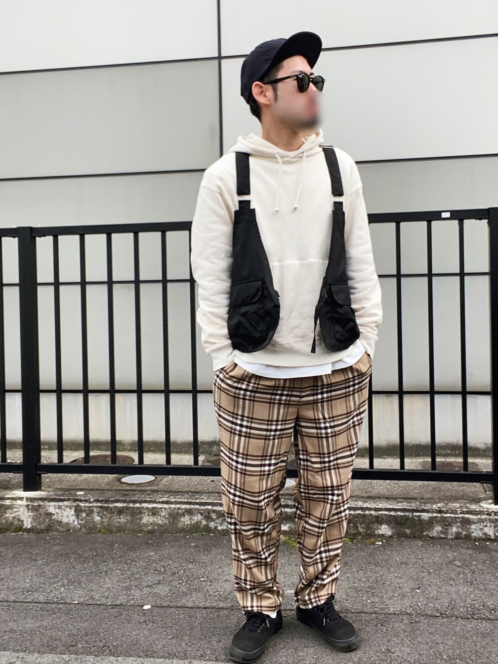 チェックパンツ×ベスト。
