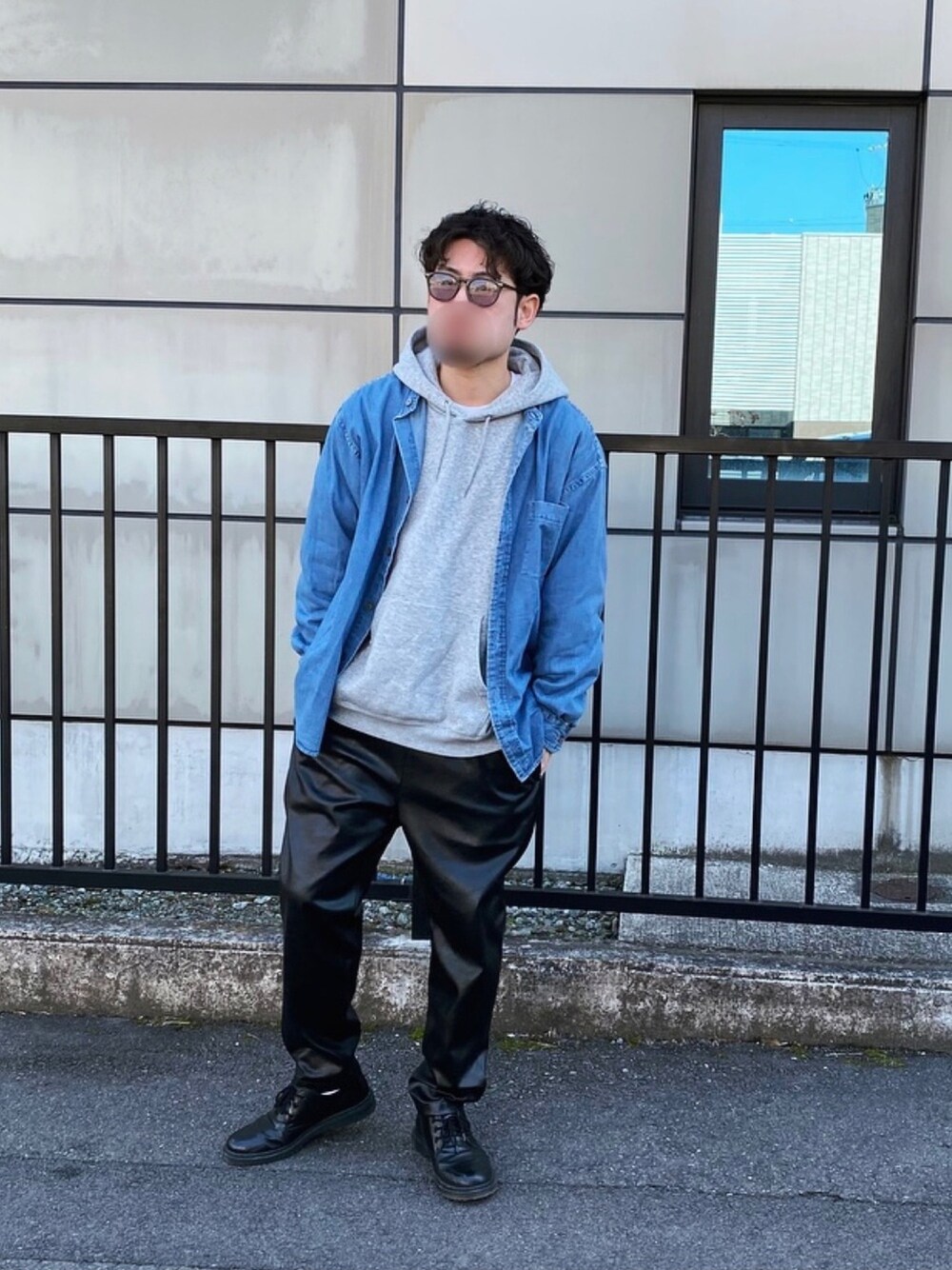 前回と同じようにレザーとデニムで組み合わせつつパーカーをプラスしてよりストリートカジュアルな雰囲気に。 シャツの中にパーカーを着てもスタンドカラーシャツにすることで首元がごちゃつかずに綺麗に着れます。