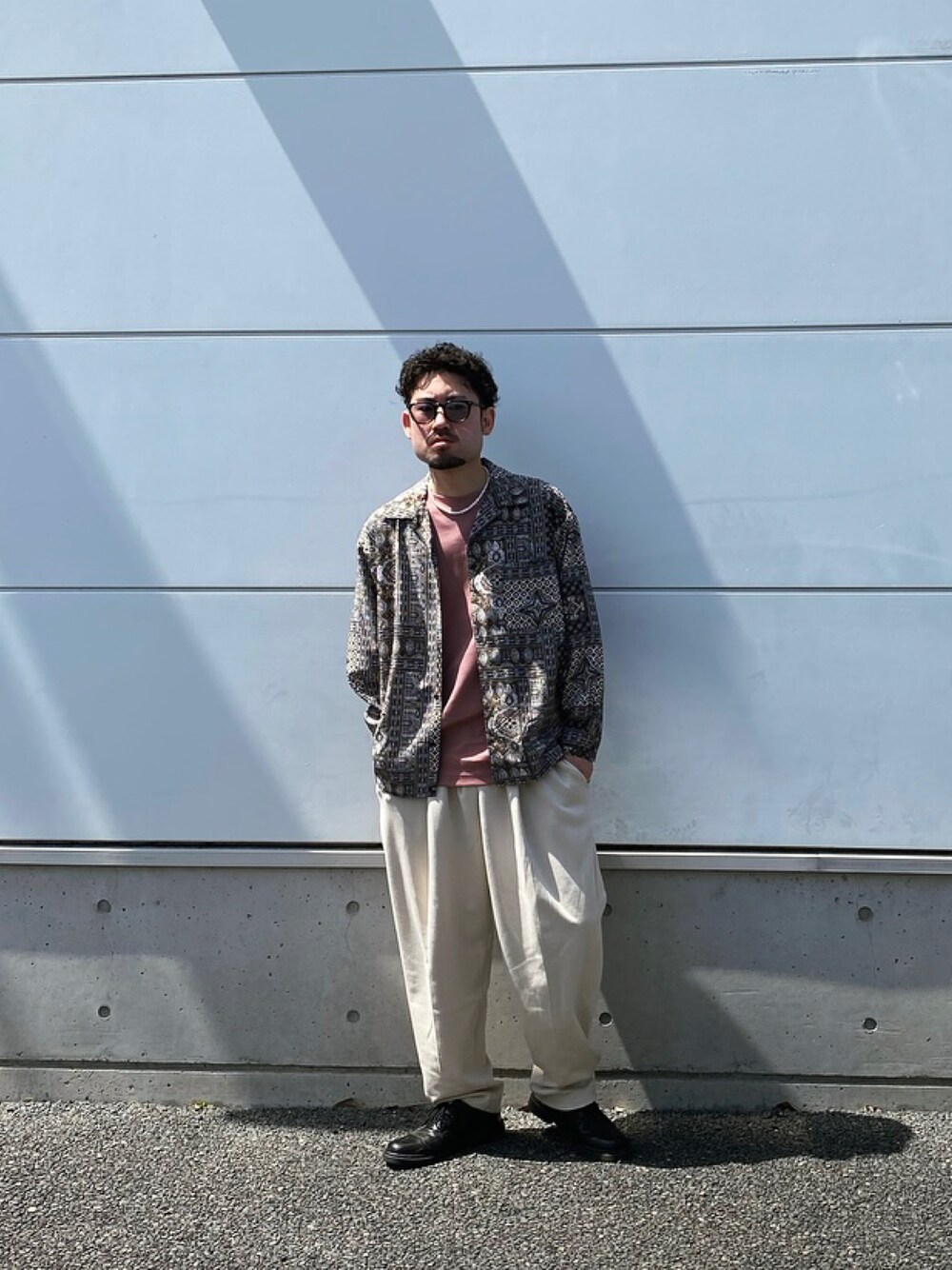 柄シャツを主役にして、チンピラ感を少しでもマイルドにするのと春らしさを加える為にピンクのTシャツとホワイトのパンツを合わせてみました。