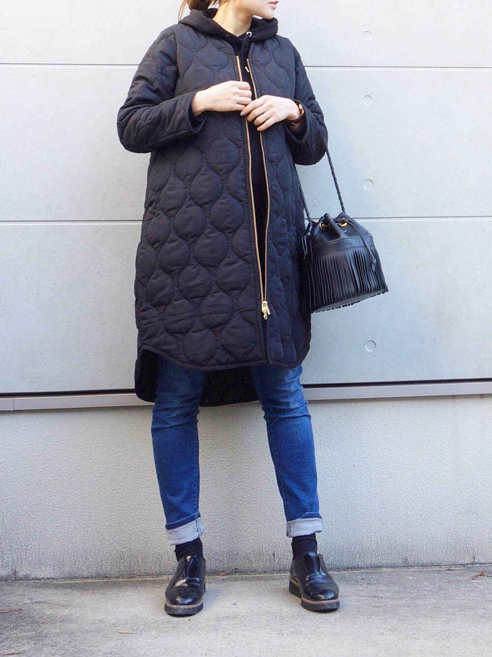 Eのミリタリージャケット「ミリタリーノーカラーキルティングコクーンコート」を使ったコーディネート