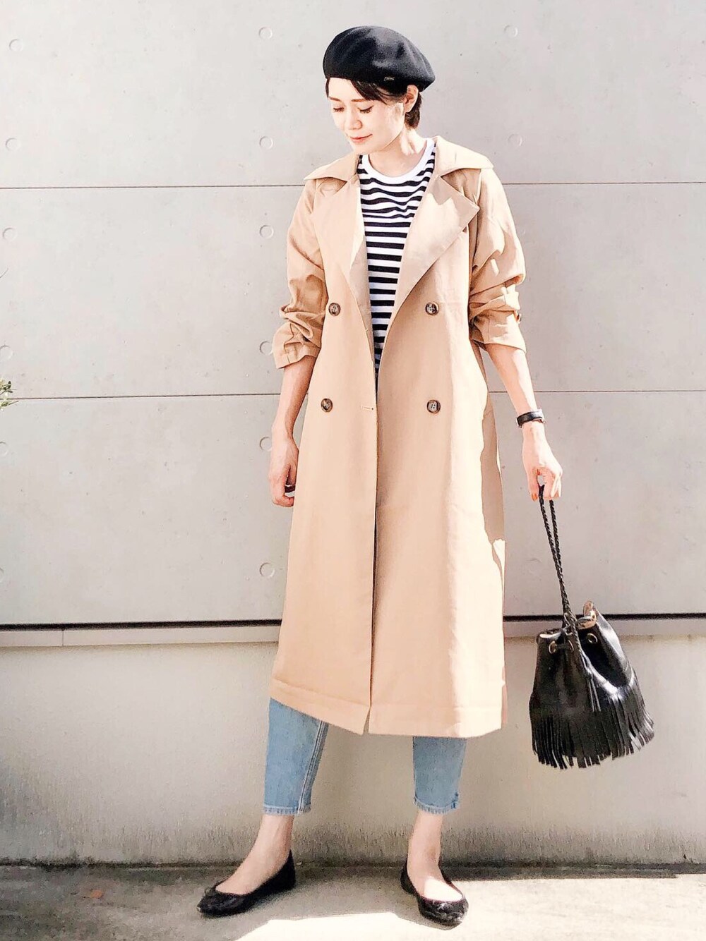 Eのトレンチコート「バックプリーツライトトレンチコート」を使ったコーディネート