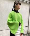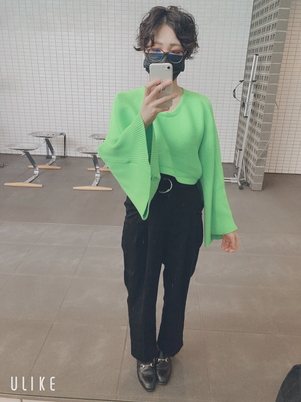 蛍光グリーンの3wayニットです。 色々気回せそうです。 今日はショート丈トップスで。