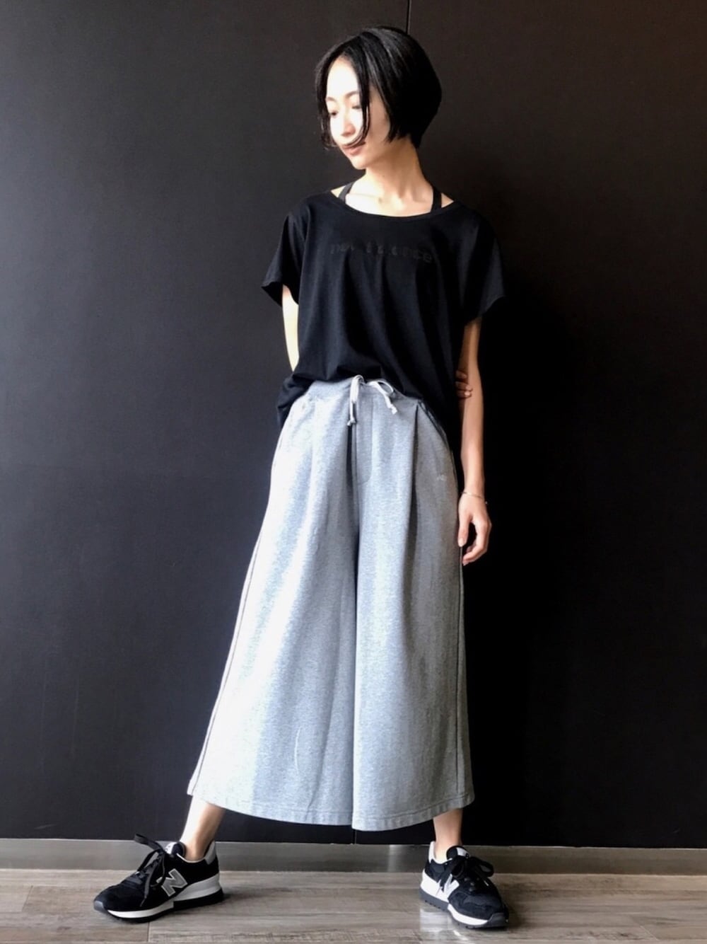 モノトーンで纏めたリラックススタイル トップスはトレーニング用にも使えるnew balance tee。 襟ぐりが広いTシャツはブラトップと合わせると安心です。 汗が気になる季節もサラッと着られるコーディネートです。