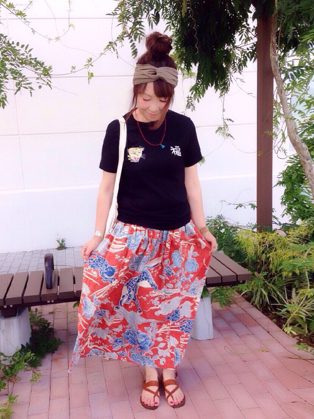 今日はパパりん(旦那ちゃん)と KALDIに タイカレーの材料を買いに 行ってきました(´•.̫ • ⋈)♡ 5年前に スパイシーな自家製タイカレーに ハマってからは ずーっと 大人はタイカレー 子どもは甘口 二種類作ります。 ナンにつけて 食べると めっちゃ美味しいですー٩(♡ε♡ )۶ 夏は 10日に1回のペースで レッド イエロー グリーン のローテーションカレー になります٩(●˙▿˙●)۶ なので お洋服もアジアンテイストを 意識して KAPITALのネコマイスカート 東洋エンタープライズのスカTを 合わせて 着てみました。