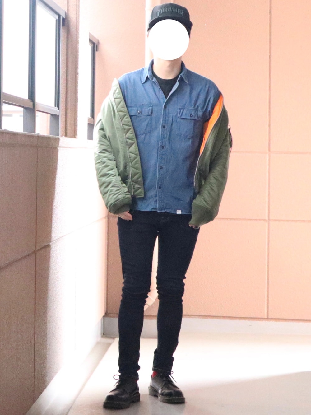 いつもいいね、お気に入りありがとうございます😆 フォロワー300人達成できました! 嬉しいです🎶 これからも週1投稿頑張ります✨ デニムシャツ✖️MA-1アースカラーコーデ📸 ブルーのデニムシャツにグリーンのMA-1を羽織り、アースカラーコーデしました! その他は暗めのネイビー、ブラックで統一したので、アースカラーの際立つコーデになりました🤔 アウターは肩落としスタイルでかわいく着てみました😙 別ポーズでは普通に羽織ったスタイル載せたのでよかったら見て下さい♪ いいね、お気に入り、フォローもお気軽にお待ちしてます☆