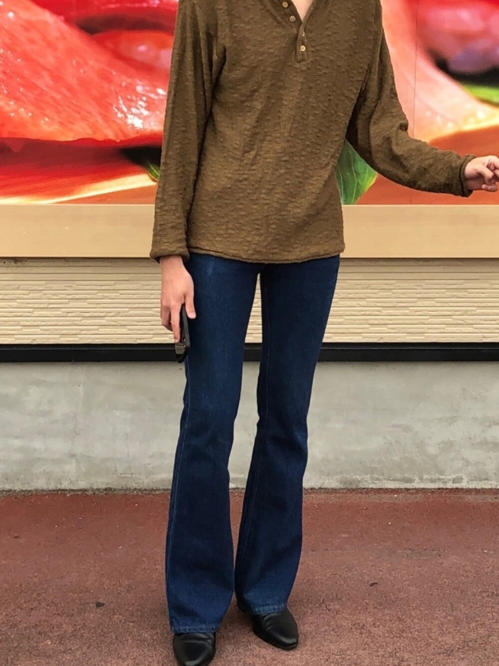 500円のフレアラングラーとこれまた500円のよくわからんニット地のヘンリーネックT やる気感じないように見せかけて寿司屋まで行く元気はある