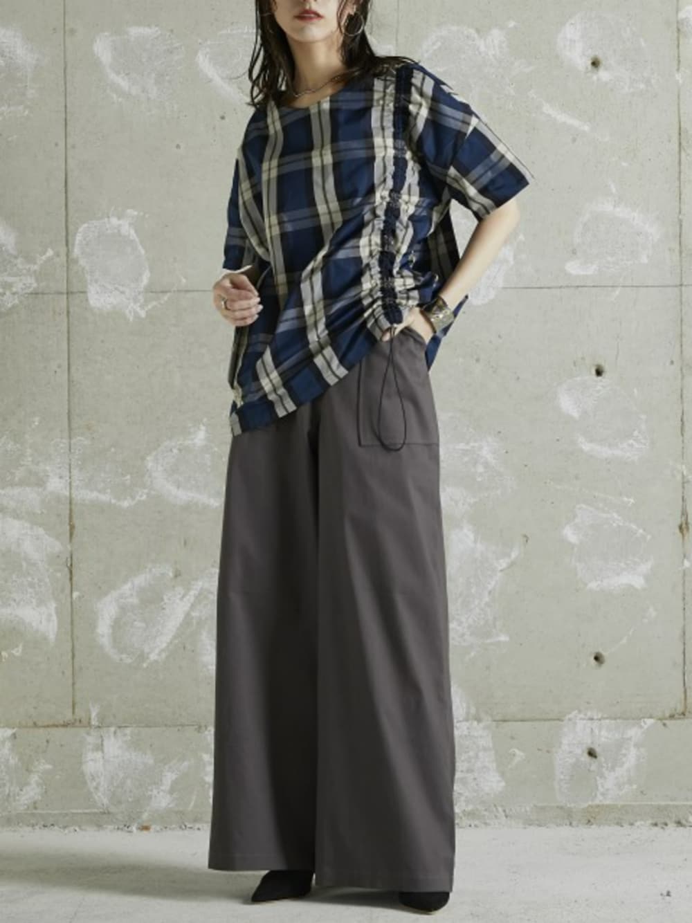 nissen Ladies Models(nissen本店models)のシャツ/ブラウス「Vネック総柄デザインサイドシャーリングトップス [Soiunique]」を使ったコーディネート