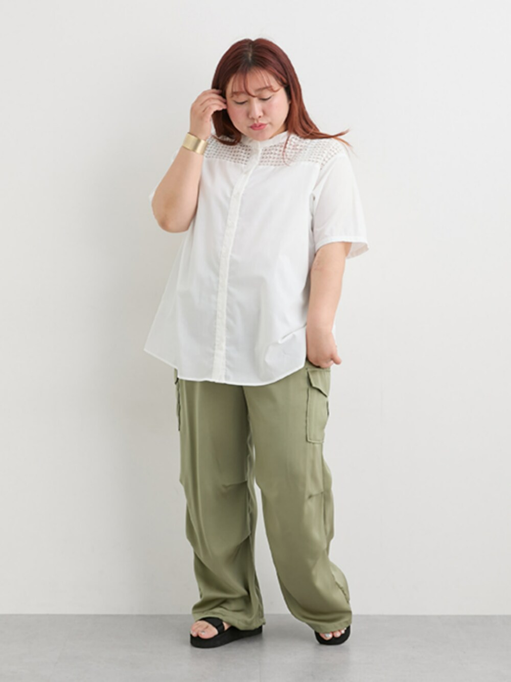 nissen Ladies Models(nissen本店models)のシャツ/ブラウス「<大きいサイズ> ゆるシルエットヨークレースデザインブラウス」を使ったコーディネート