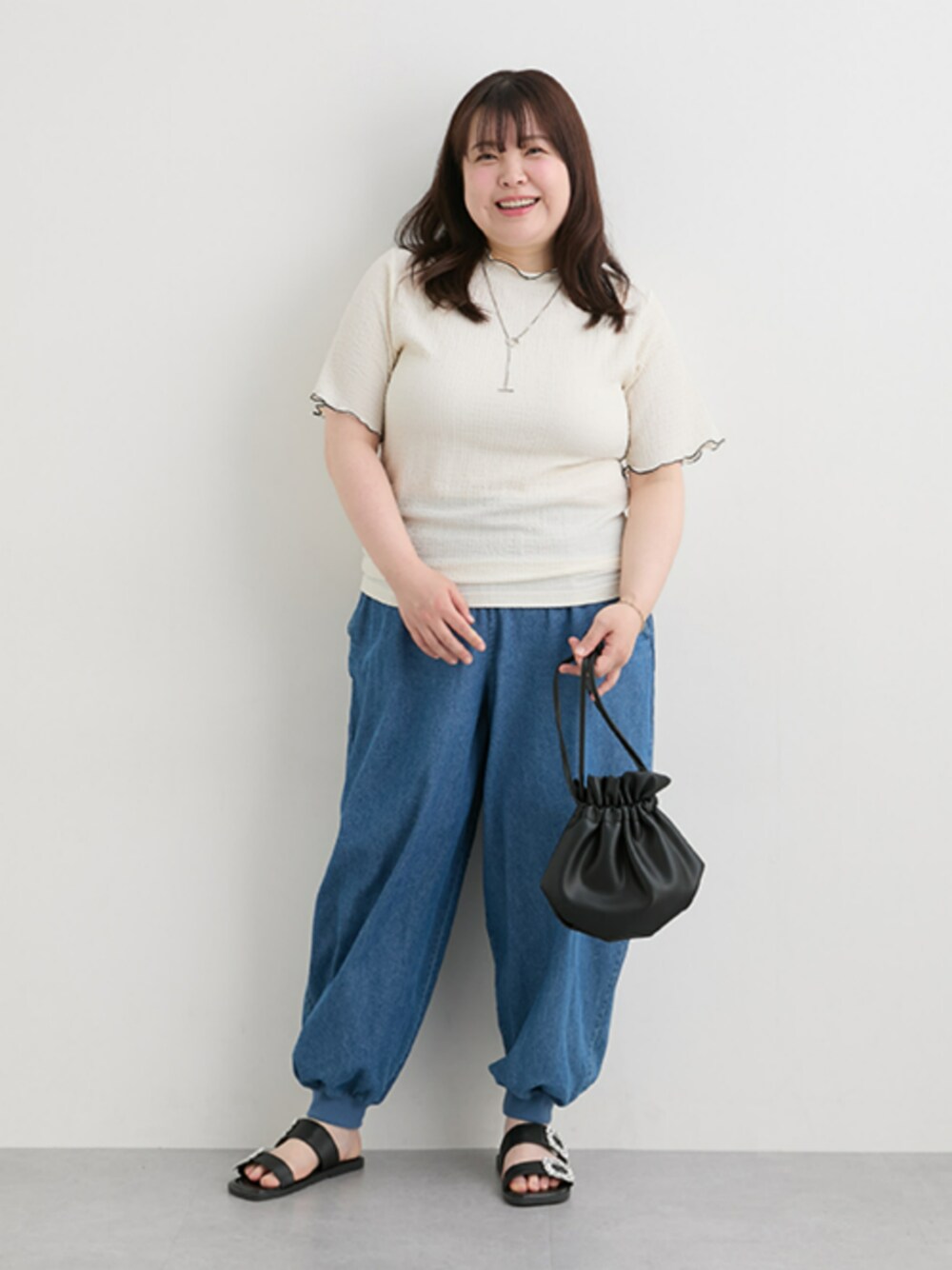 nissen Ladies Models(nissen本店models)のパンツ「<大きいサイズ>楽ちんデニム裾リブパンツ(ゆったりヒップ)」を使ったコーディネート