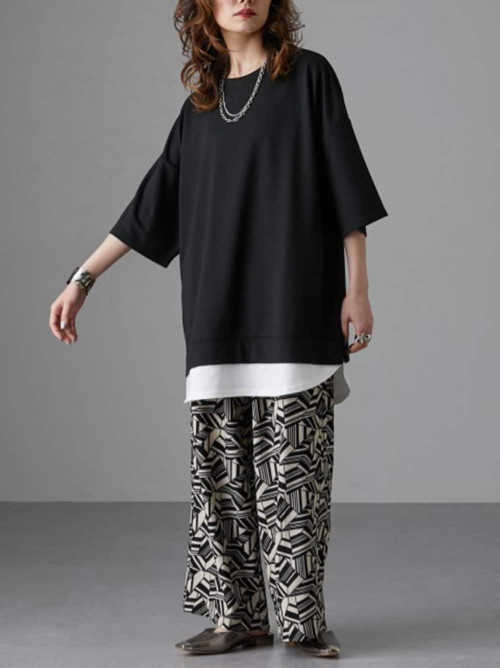 nissen Ladies Models(nissen本店models)のパンツ「幾何学柄オーバーシルエットワイドパンツ [Soiunique]」を使ったコーディネート