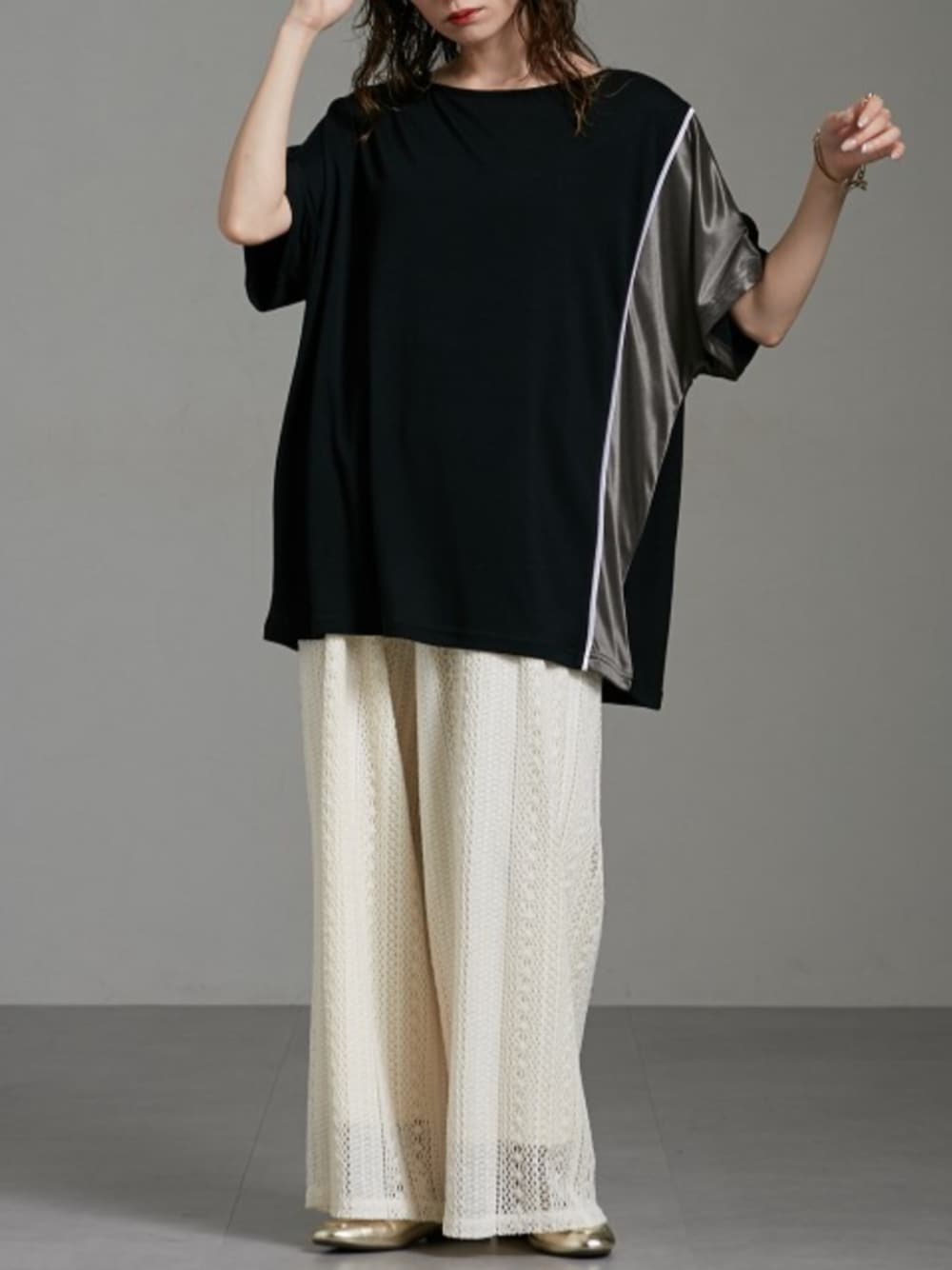 nissen Ladies Models(nissen本店models)のTシャツ/カットソー「サイド配色切替ゆったりサイズ半袖Tシャツ [Soiunique]」を使ったコーディネート