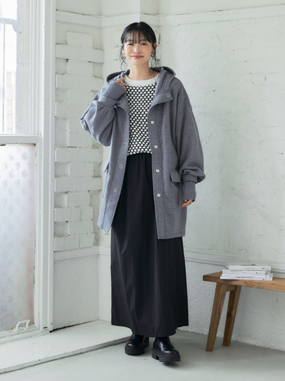 nissen Ladies Models(nissen本店models)のジャケット/アウター「裏起毛リブ切替立衿ジップアップパーカーライトコート<大きいサイズ有>」を使ったコーディネート
