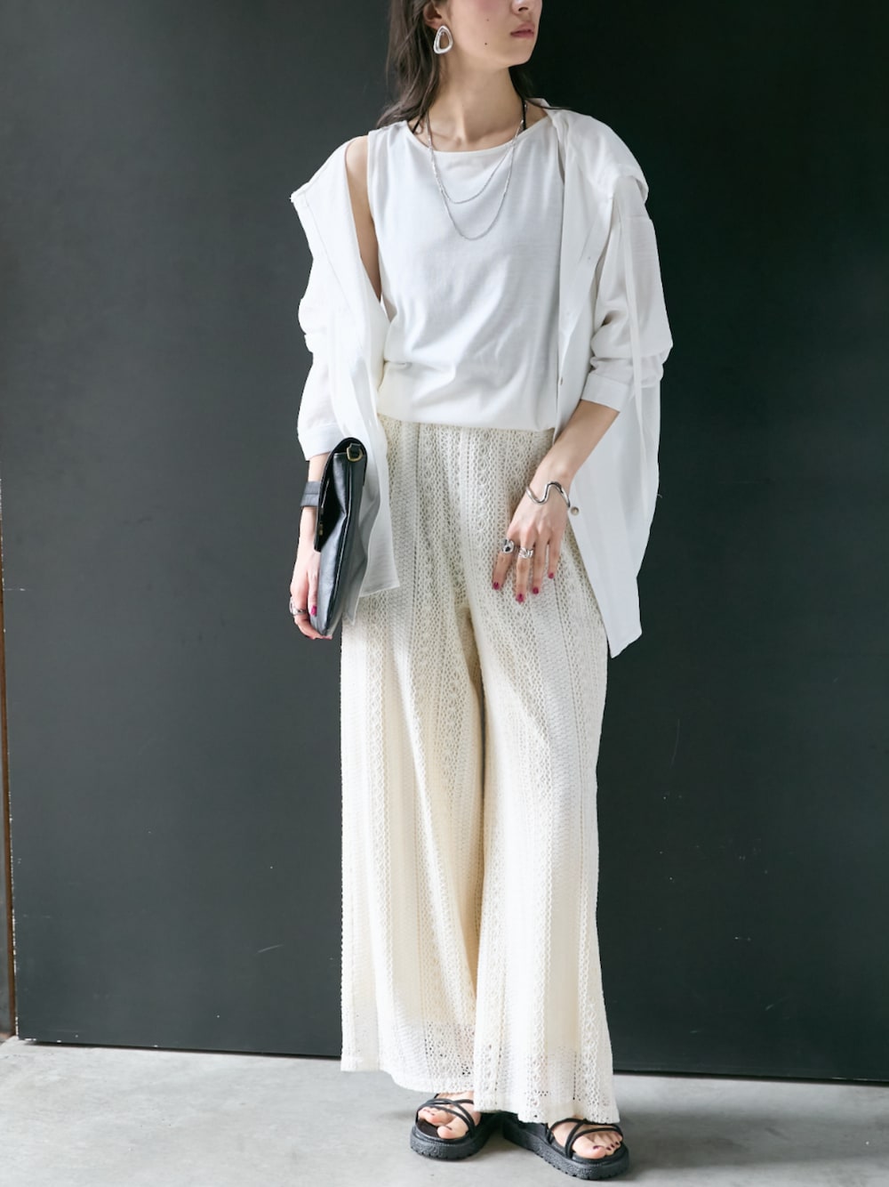 nissen Ladies Models(nissen本店models)のパンツ「レース透かし編みデザインゆったりサイズワイドパンツ [Soiunique]」を使ったコーディネート