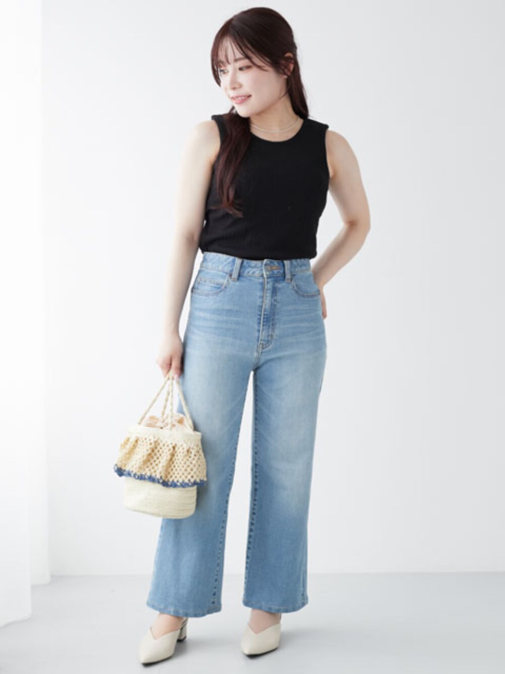 nissen Petit Models(nissen本店models)のパンツ「小さいサイズ すごく伸びるワイドデニムパンツ(選べる2レングス) ストレッチジーンズ 低身長さん・小柄女性」を使ったコーディネート