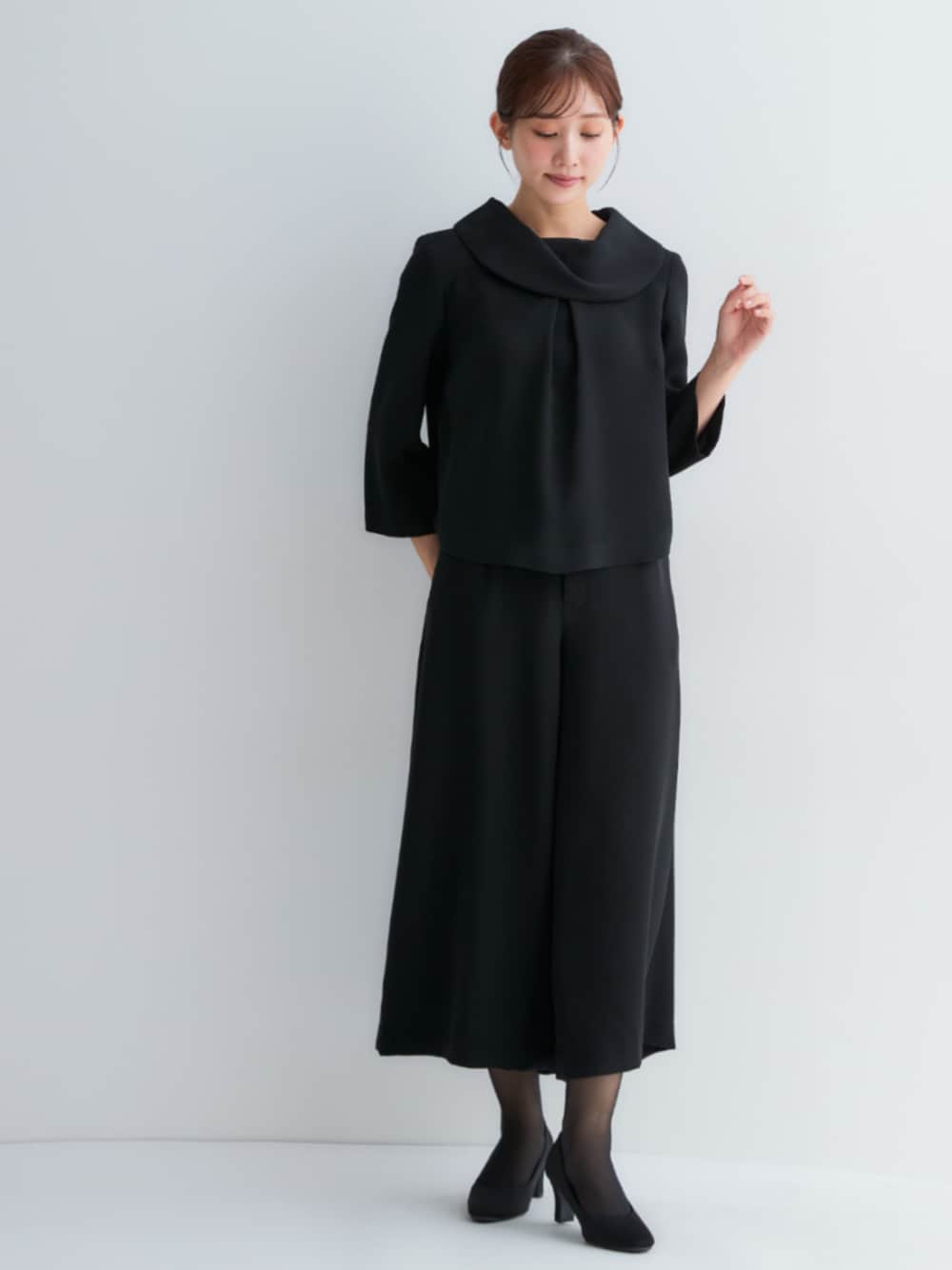 nissen Petit Models(nissen本店models)のスーツセット「小さいサイズ 【喪服・礼服】日本製生地使用 洗える防しわ加工ロールネックブラウス+ワイドパンツセットアップ 低身長さん・小柄女性」を使ったコーディネート
