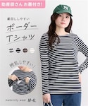 授乳しやすいと先輩ママに好評のめくるタイプの授乳仕様のTシャツを着用。パンツは、サイズ調節が簡単で、お腹を締め付けにくく快適な履き心地。ゆったりとしたテーパードシルエットで、きちんと感のあるキレイめデザインで、シンプルカジュアルなコーデ