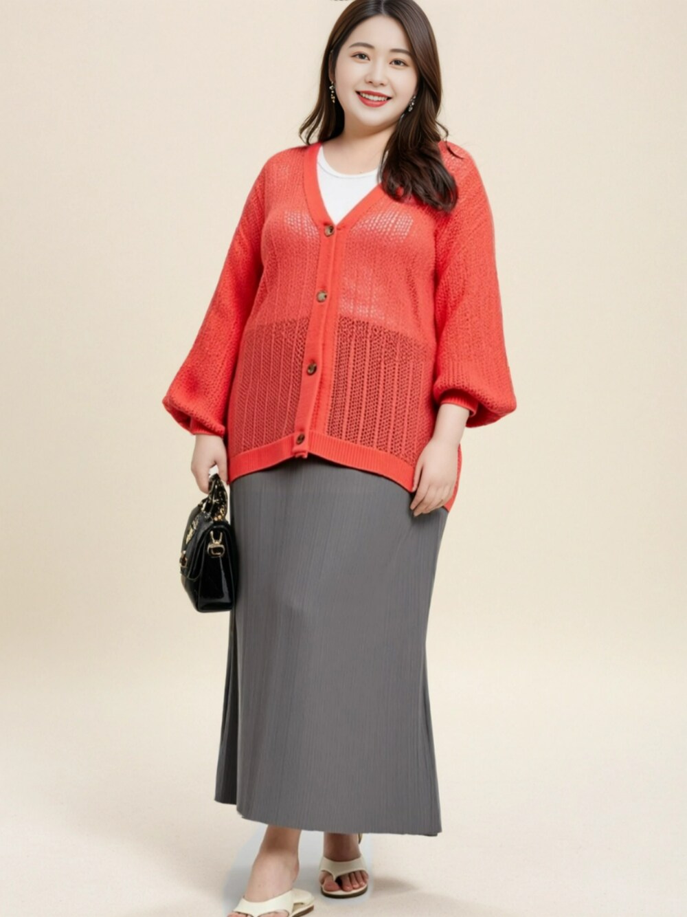 nissen AI Models(nissen本店models)のカーディガン/ボレロ「<大きいサイズ> 透かし編2WAYカーディガン」を使ったコーディネート
