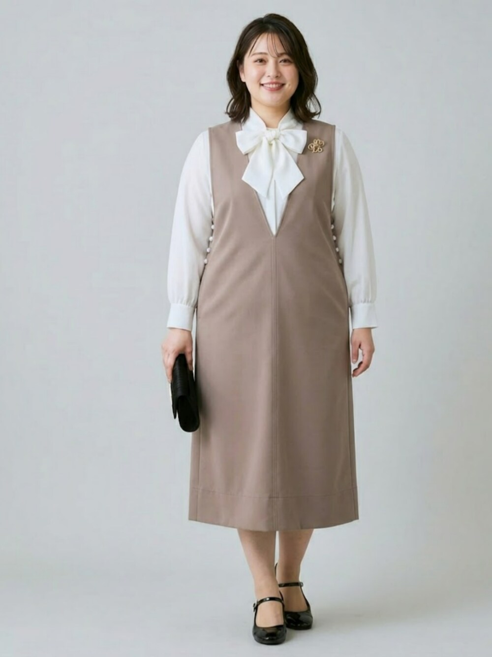 nissen AI Models(nissen本店models)のスーツセット「【入学式・卒業式】ダブルクロスジャンパースカート+ボウタイリボンブラウスストレッチセットアップ(ブローチ付)<大きいサイズ有>」を使ったコーディネート