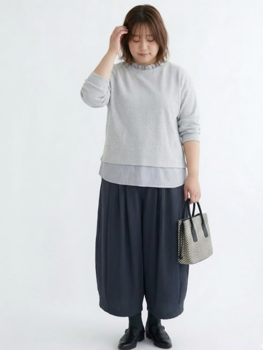 nissen AI Models(nissen本店models)のその他パンツ「<大きいサイズ> ラインを拾わないスカート見え9分丈タックパンツ(ゆったりヒップ)」を使ったコーディネート