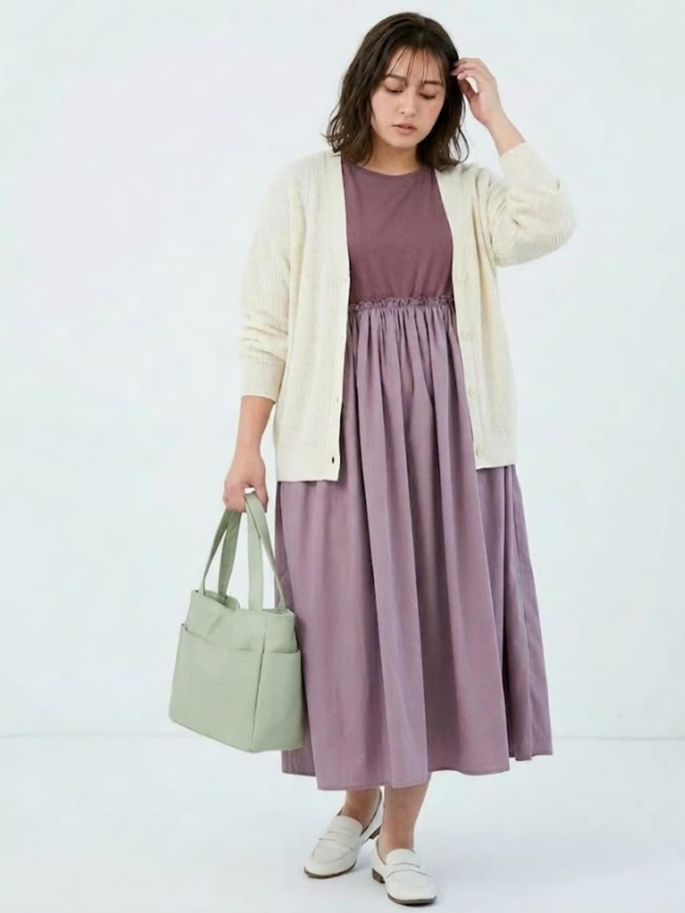 nissen AI Models(nissen本店models)のワンピース「<大きいサイズ>異素材コンビドッキングワンピース」を使ったコーディネート