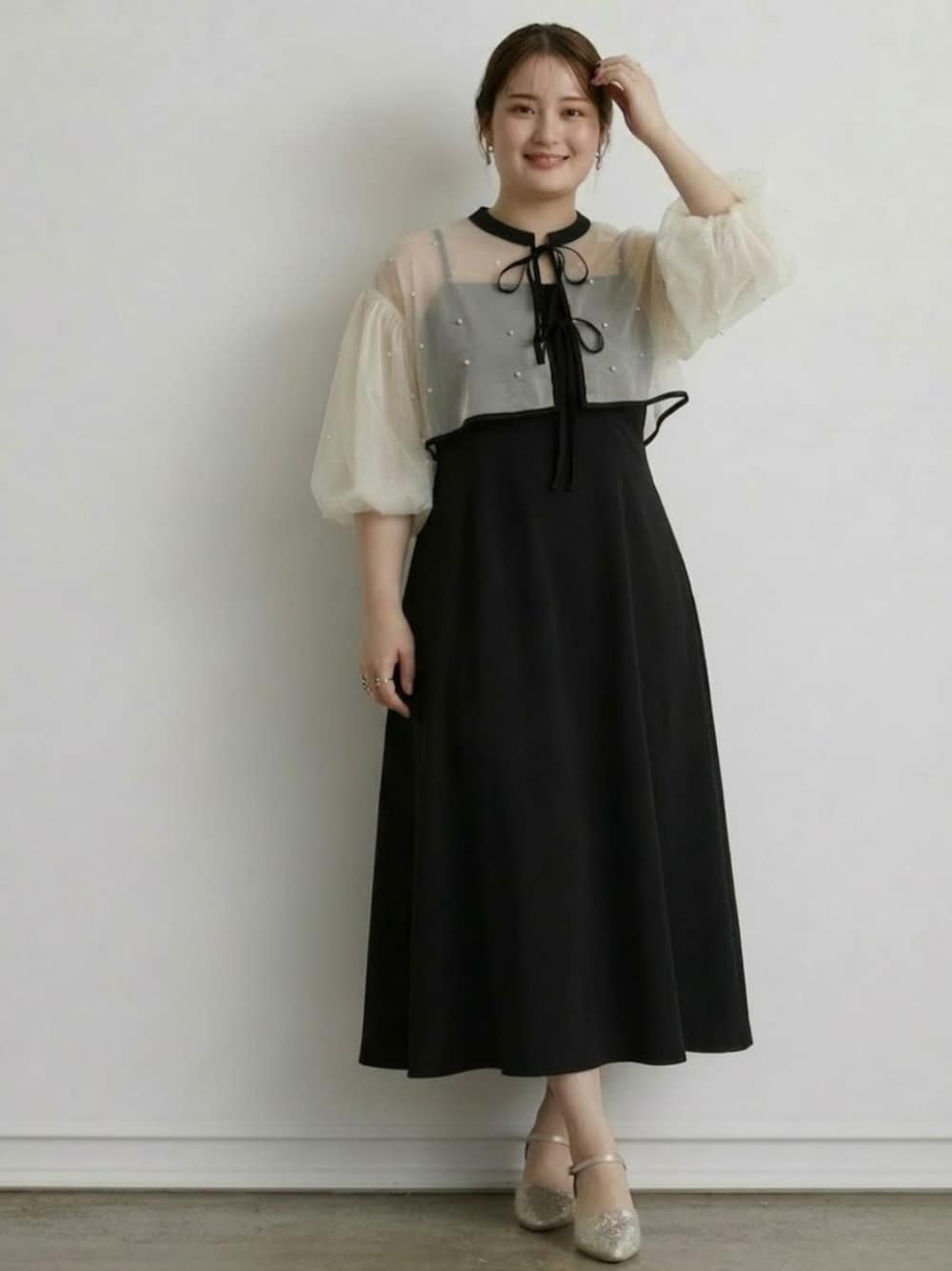 nissen AI Models(nissen本店models)のドレス「【再入荷!】パール付きチュールボレロ+キャミワンピースドレス」を使ったコーディネート